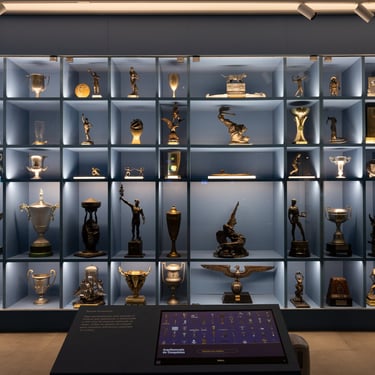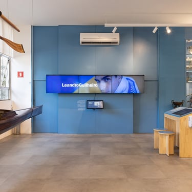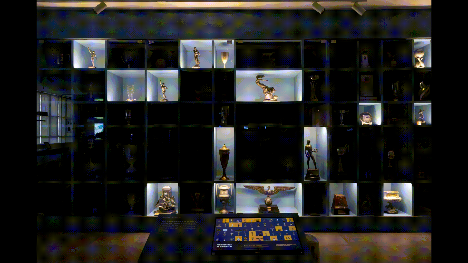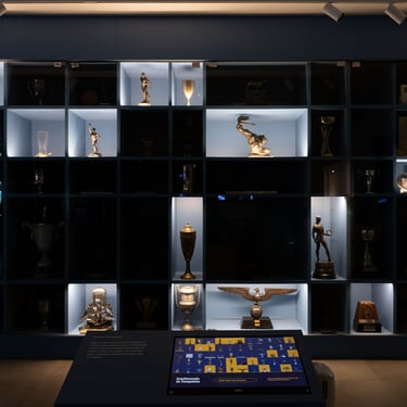 A estante dos troféus é um dos pontos altos da visita. Com iluminação individual, cada peça ganha destaque quando selecionada pelo visitante em uma tela interativa, que permite explorar por modalidade, época ou categoria. Uniformes originais, medalhas e documentos complementam a exposição em vitrines centrais, projetadas para revelar diferentes ângulos e detalhes das peças.